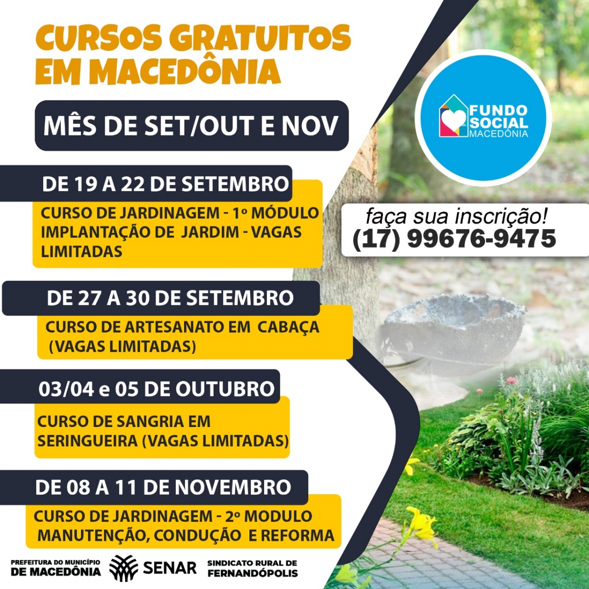 As vagas são limitadas e as inscrições podem ser feitas pelo telefone 17-99676-9475.