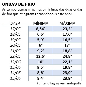 As duas ondas de frio que atingiram Fernandópolis este ano chegaram ainda no outono. A primeira chegou em maio. Entre os dias 17 e 22 de maio, Fernandópolis registrou as temperaturas mais baixas do ano (veja quadro). A menor temperatura foi registrada pelo Ciiagro no dia 19 de maio (5,9°). A temperatura mínima chegou a 12,6° no período. Já a máxima variou entre 16,5° e 24,8°.