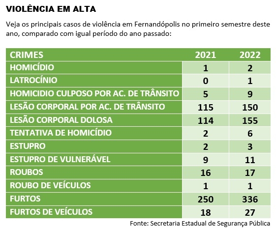 O número de crimes contra a vida aumentou neste primeiro semestre. Fernandópolis registrou dois homicídios e um latrocínio.