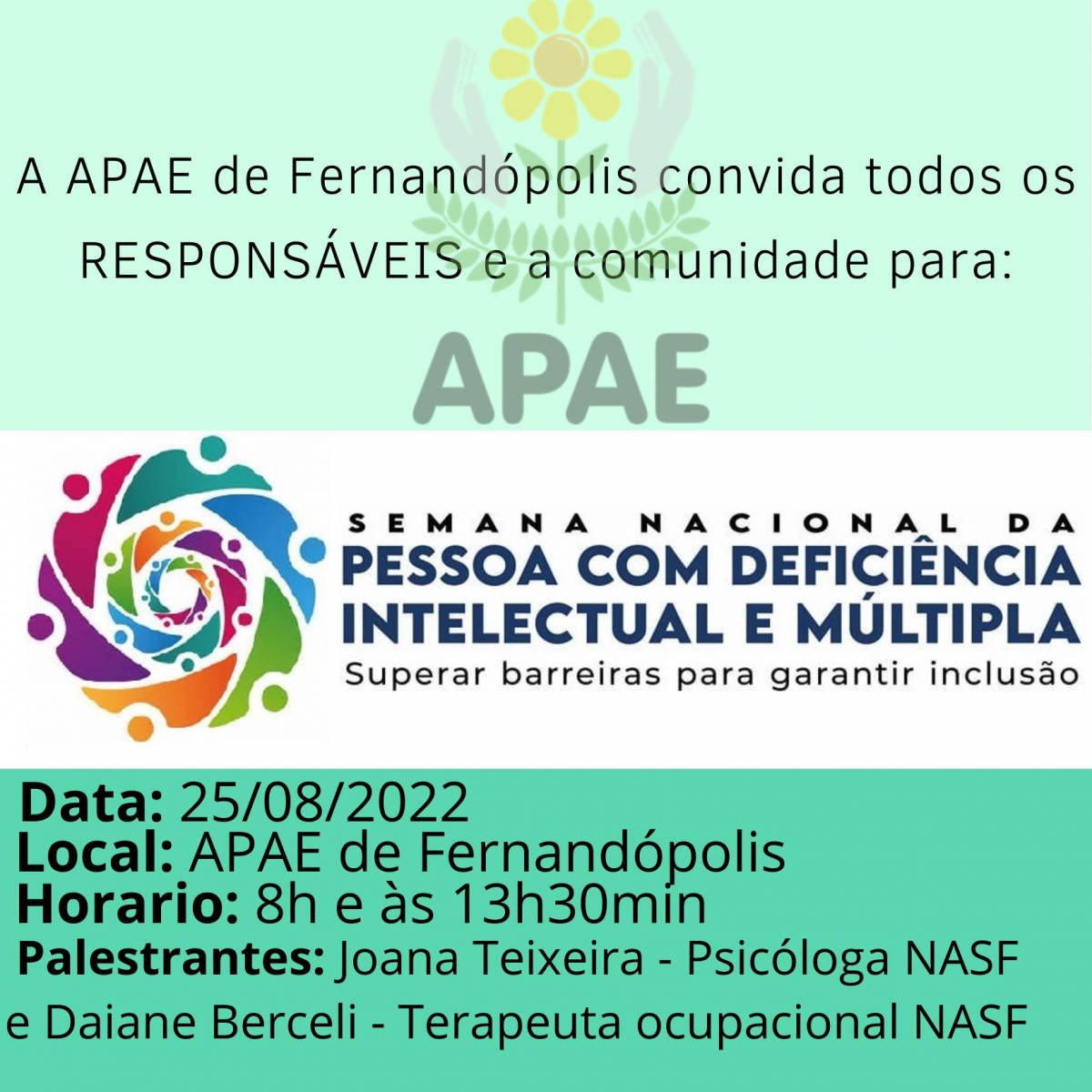 A APAE – Associação de Pais e Amigos dos Excepcionais - de Fernandópolis realiza hoje, 25, uma palestra com o tema “Superar as barreiras para garantir a inclusão”. O assunto é o tema da Semana Nacional da Pessoa com Deficiência Intelectual e Múltipla. A atividade será realizada na entidade m dois horários, às 8h e 13h30 e será aberta a toda a comunidade.