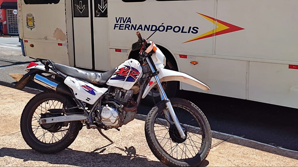 A Moto Honda XRL que era pilotada pelo motociclista Caio Venâncio Novais de Paula, 22 anos, que morreu em acidente de trânsito com ônibus da empresa de transporte coletivo de Fernandópolis