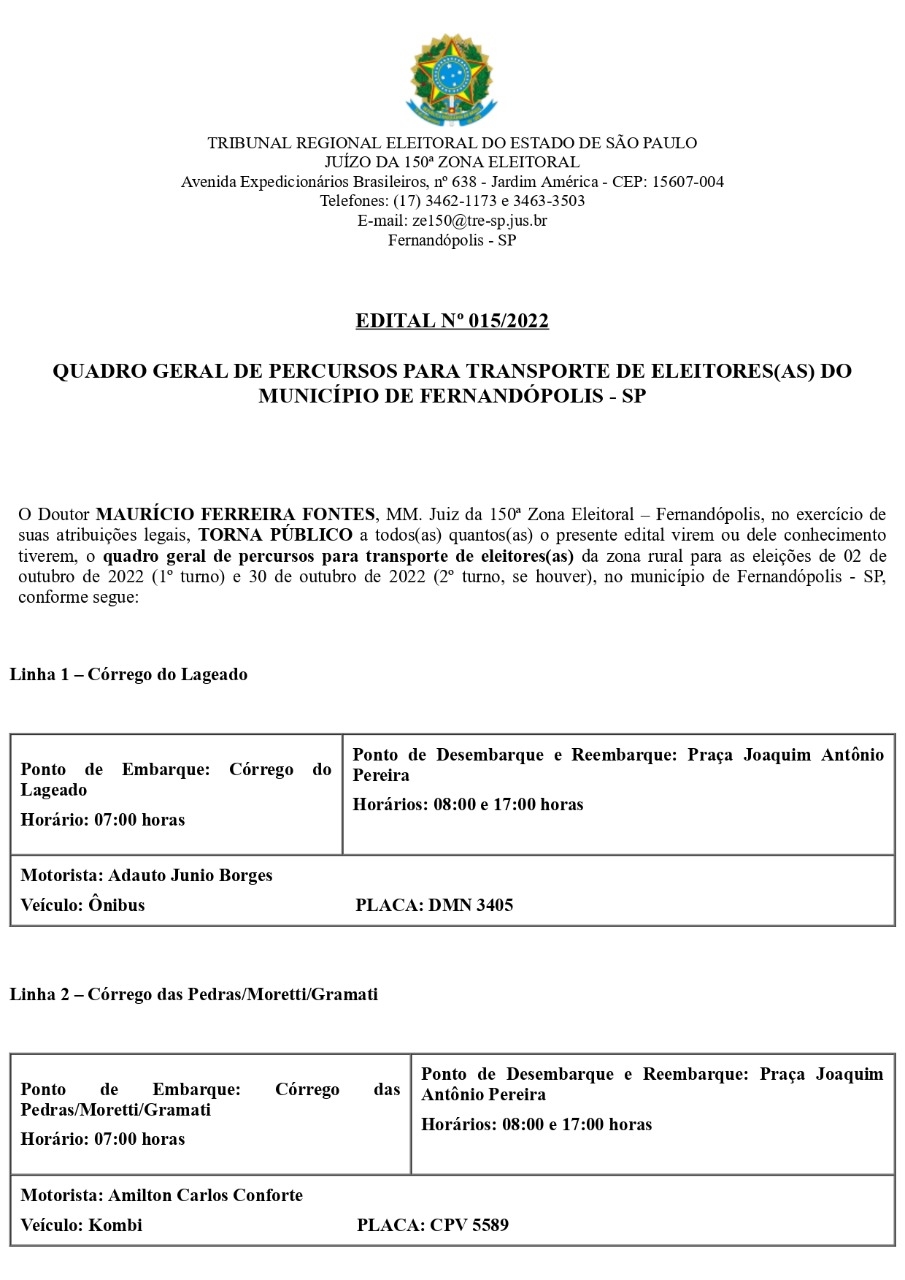 O Juiz da 150ª Zona Eleitoral de Fernandópolis Mauricio Ferreira Fontes definiu através de edital o quadro geral de percursos para o transporte de eleitores da zona rural para as eleições de 2 de outubro (1º turno) e 30 de outubro (2º Turno).