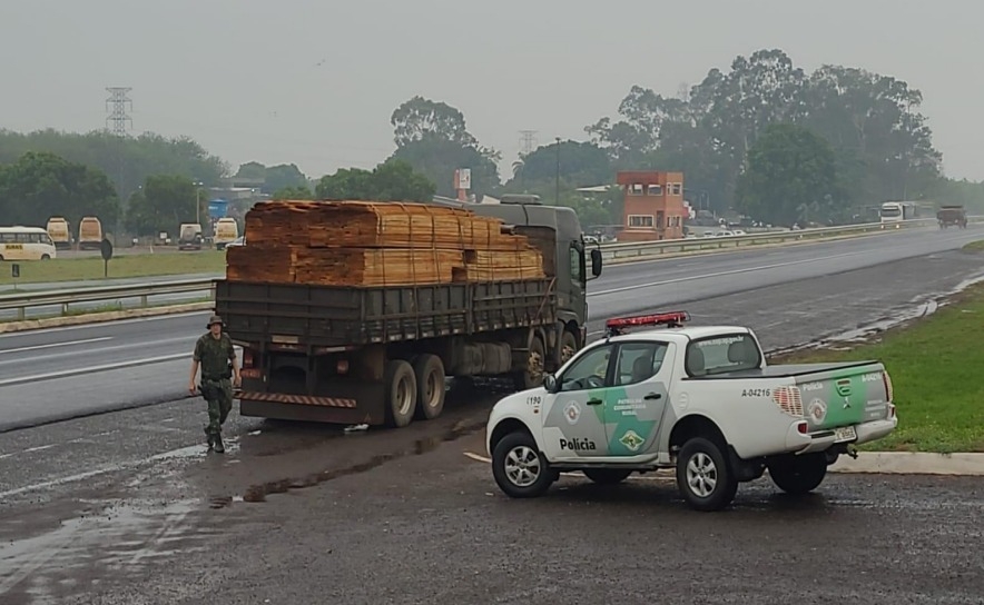 Além da fiscalização em propriedades, a Polícia Ambiental também realiza ações pelas rodovias de nossa região com o foco de caminhões transportando madeira nativa.