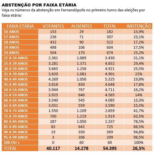 Entre os mais jovens, a abstenção foi alta no grupo entre 20 a 29 anos: foi de 25,2% entre os eleitores com 20 anos; 31,1% na faixa entre 21 a 24 anos; e 29,4% na faixa dos 25 a 29 anos. Em números, foram 2.610 eleitores que deixaram de ir às urnas no dia 2 em Fernandópolis com abstenção de 29,8%.