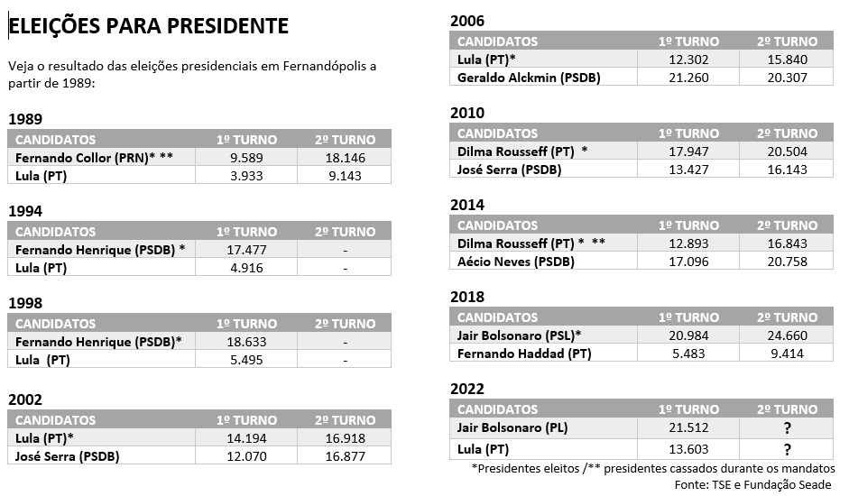 Apenas dois presidentes eleitos desde 1989, marco da redemocratização do Brasil, não foram os mais votados em Fernandópolis: na reeleição de Lula (PT) em 2006, quando perdeu para Geraldo Alckmin (PSDB) nos dois turnos e em 2014 com Aécio Neves (PSDB) batendo Dilma Rousseff (PT).