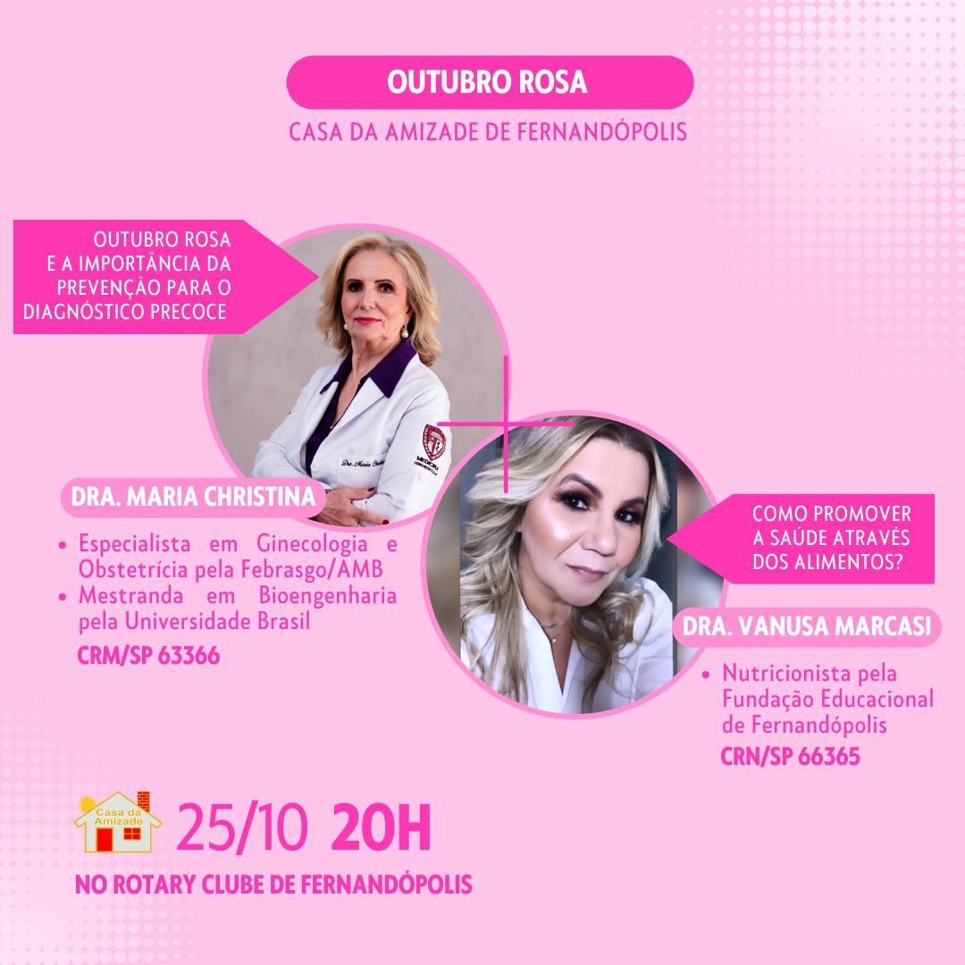 Hoje, 25, a partir das 20h, a Casa da Amizade do Rotary Club de Fernandópolis irá promover duas palestras sobre o Outubro Rosa. O evento acontece na sede da entidade na Av. Líbero de Almeida Silvares, 2906 - Bairro Coester.
