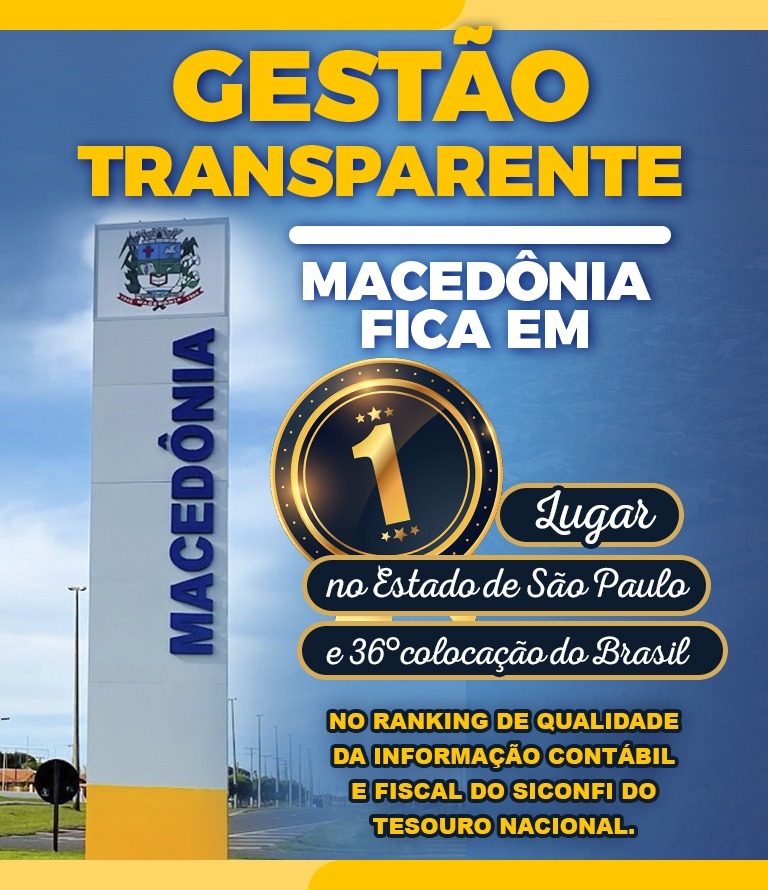 A cidade de Macedônia conquistou o 1º lugar do Estado de São Paulo no ranking de qualidade da Informação Contábil e Fiscal do Siconfi do Tesouro Nacional. No Brasil, o município conquistou a 36ª posição.