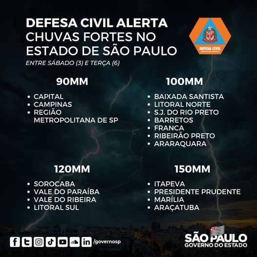 Alerta divulgado nesta sexta-feira, 2, pela Defesa Civil do Estado de São Paulo