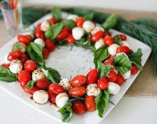 Por exemplo com tomate cereja, bolinhas de mussarela de búfala e manjericão é possível fazer uma guirlanda que irá decorar e, claro, será um petisco maravilhoso com um molho pesto por cima. Seguindo a mesma linha de ingredientes. Com tomate e queijo em rodelas também é possível fazer uma bengala de Natal lindona!