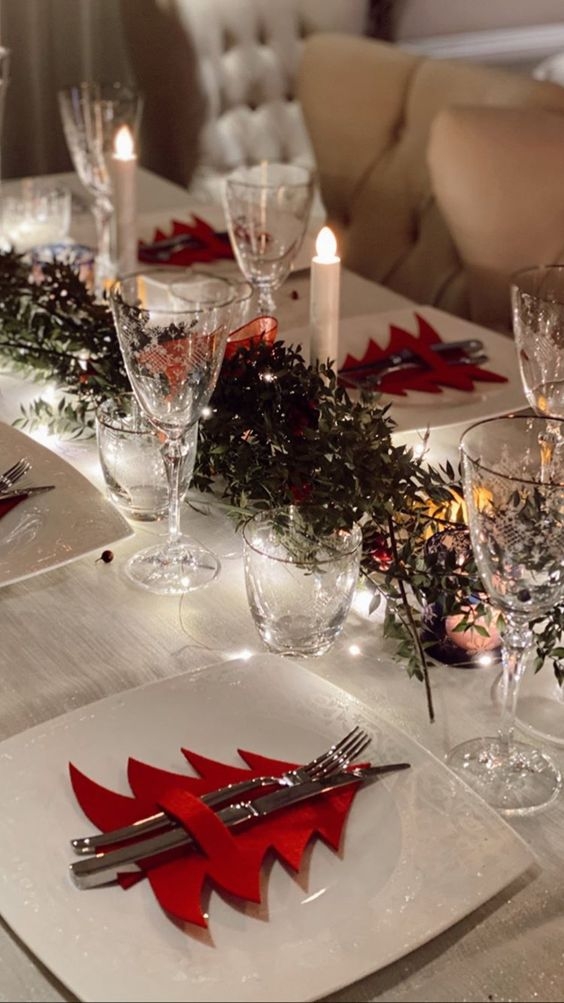 Ainda na mesa posta, para dar um charme todo especial, sem precisar fazer um mega investimento, minha dica é fazer um porta talher no formato de árvore de natal de feltro. Não! Você não precisa ter habilidade artesanal nenhuma. Basta saber recortar e pronto! Só imprimir o molde de árvore e recortar no feltro vermelho ou verde e pronto. Fica lindo demais.