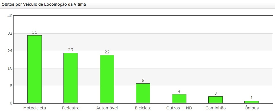 A maioria das vítimas, 63,44% eram condutores do veículo, 24,73% pedestres e 7,53% passageiros e outros 4,3% sem informações disponíveis. Foram 37 colisões, 25 atropelamentos, 19 outros tipos de acidentes, 6 choques e 6 não especificados.
