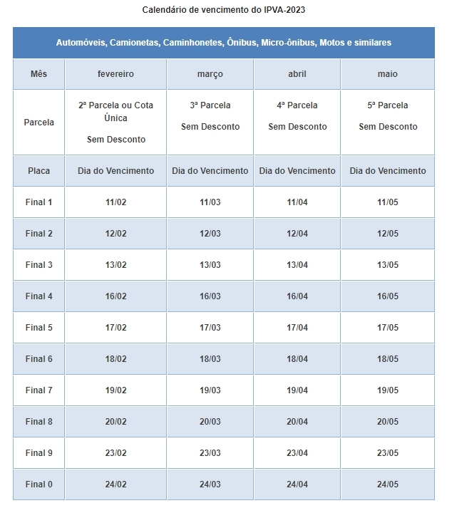 Em 2023, pela primeira vez, todas as datas de vencimento das parcelas serão no mesmo dia de cada mês. Os prazos de pagamento para veículos de placa final 1, por exemplo, foram fixados em 11 de janeiro, 11 de fevereiro, 11 de março, 11 de abril e 11 de maio. Se o vencimento ocorrer no final de semana ou feriado, o pagamento pode ser realizado no próximo dia útil, seguindo a regra geral do processo civil.