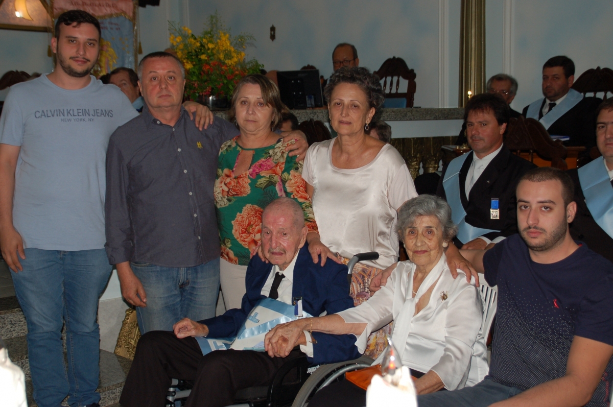 Alberto Scaloppi, um dos maçons mais antigo, ao lado da esposa Zuleica e família durante homenagem na Loja Maçônica Benjamim, Reis em 2019