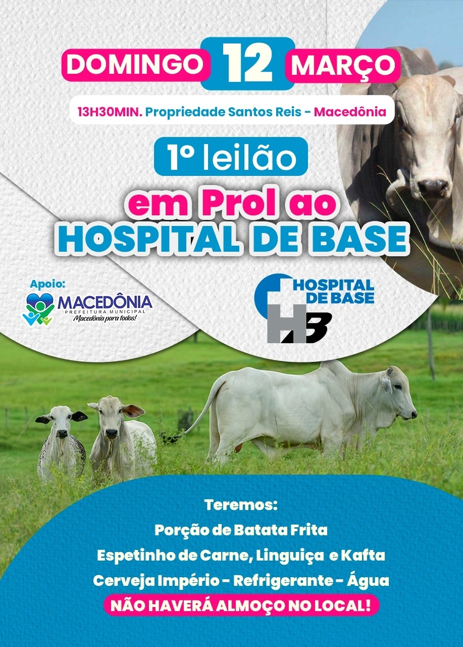 O 1º Leilão em prol ao Hospital de Base, de São José do Rio Preto, será neste domingo, 12 de março, a partir das 13h30min na propriedade Santos Reis em Macedônia.