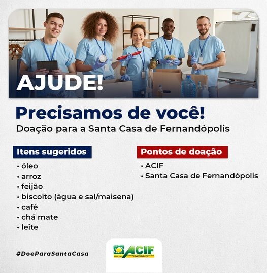 A Acif – Associação Comercial e Industrial de Fernandópolis - lançou campanha “Doe para a Santa Casa” para arrecadação de alimentos. “Nesse momento difícil, contribua na arrecadação de itens essenciais para a Santa Casa de Fernandópolis”, diz o anuncio publicado nas redes sociais.