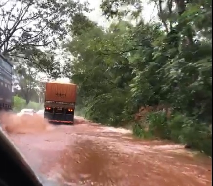 Imagens feitas pelos motoristas mostram sequencia de cachoeiras que descem dos barrancos laterais despejando água na pista