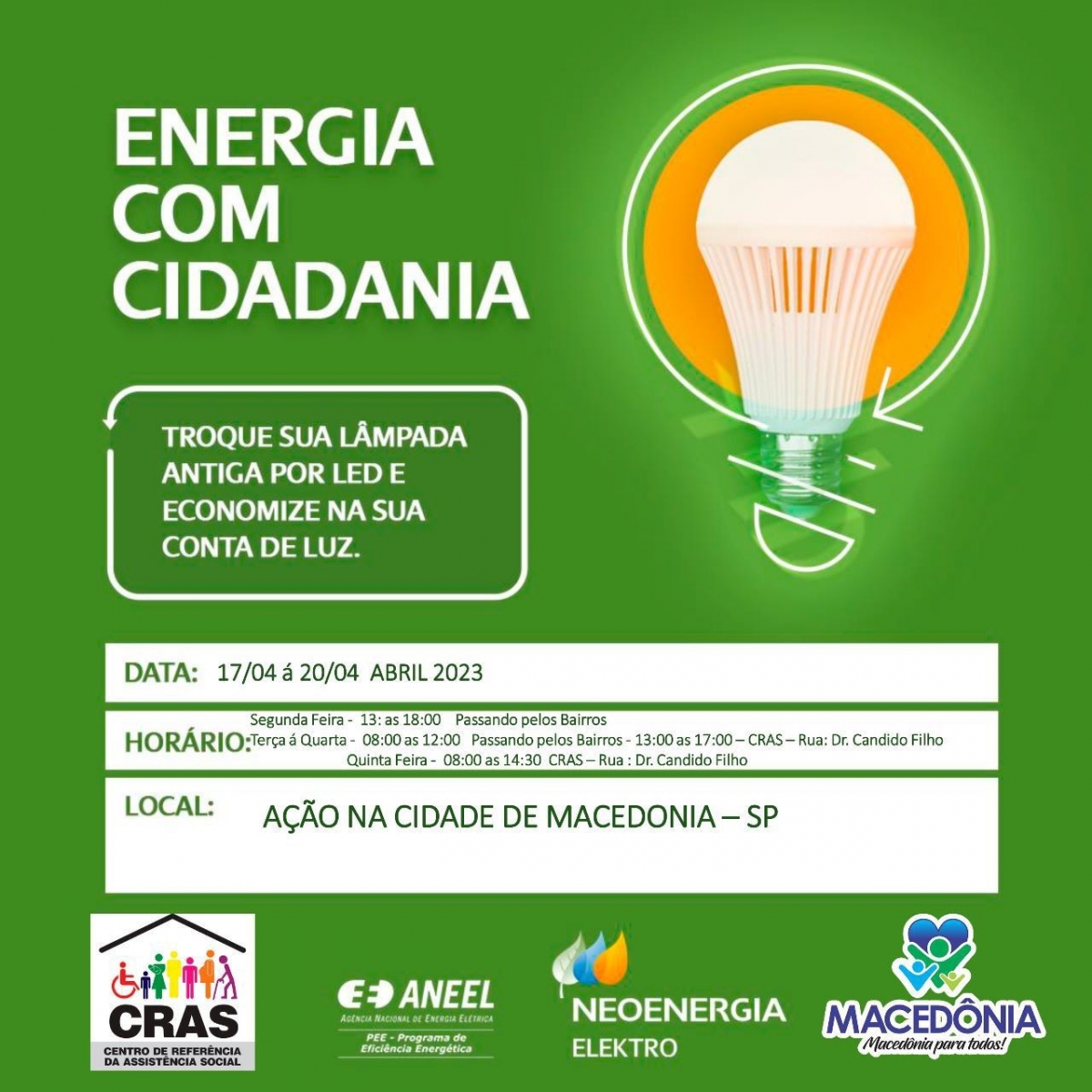 Desde ontem, 17, o município de Macedônia recebe na cidade o projeto “Energia Com Cidadania”, da Neoenergia Elektro. A ação, tem como objetivo trocar até lâmpadas incandescentes ou fluorescentes dos moradpores por lâmpadas de LED, que podem economizar até 40% na conta de luz.