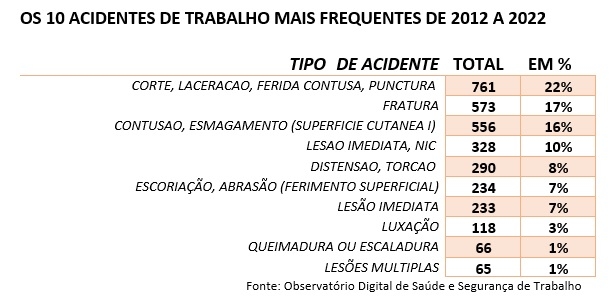 De acordo com os dados, a ocorrência com maior número de afastamentos (22%) é de acidentes com cortes, laceração, ferida contusa e punctura; seguido por fraturas com 17% (veja quadro).