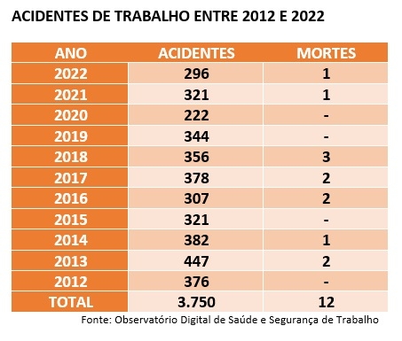 O Brasil registrou em 2022, 612.9 mil acidentes de trabalho e 2.538 mortes - alta de 22% em relação ao ano anterior – só entre trabalhadores e trabalhadoras com empregos formais, com carteira assinada e direitos, entre outros, a benefícios previdenciários.