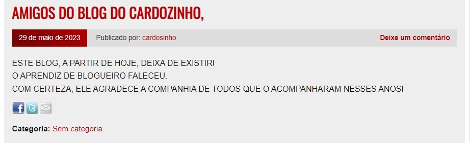 Na manhã de hoje o Blog trouxe uma postagem anunciando o fim de sua existência em decorrência do falecimento de seu autor. “Este blog, a partir de hoje, deixa de existir! O aprendiz de blogueiro faleceu. Com certeza, ele agradece a companhia de todos que o acompanharam nesses anos!”.