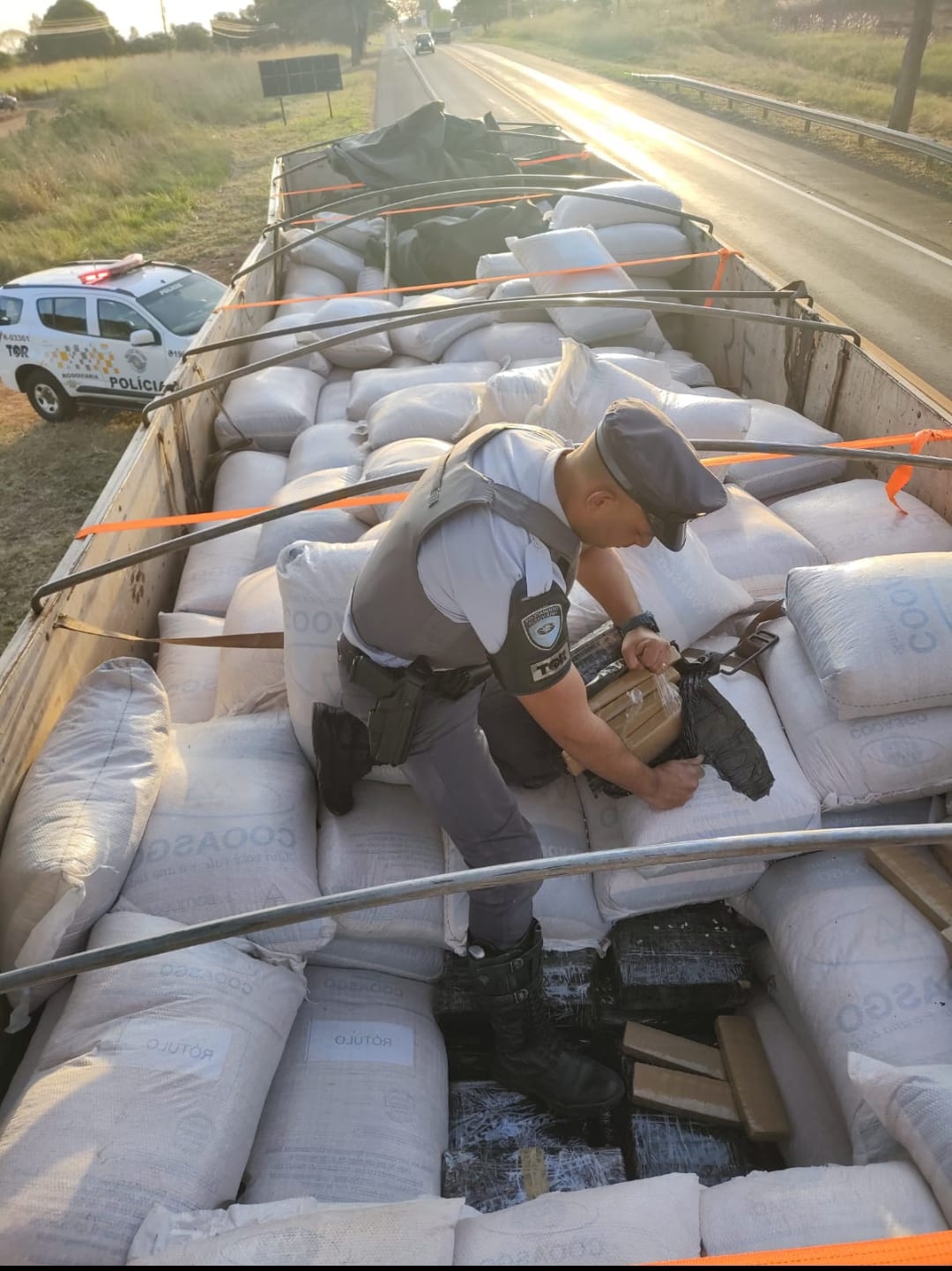 Ao averiguar a carga, os policiais encontraram 68 fardos de maconha. Os sacos utilizados para esconder a droga eram iguais aos que armazenavam o milho.