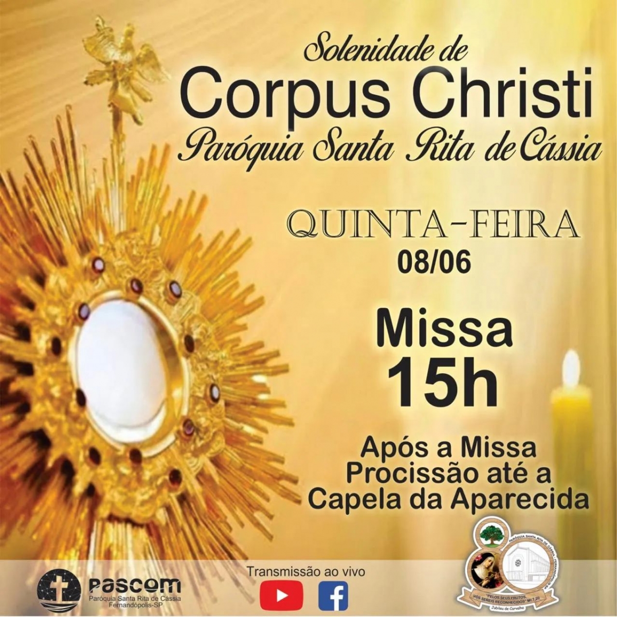 A Solenidade de Corpus Christi na Paróquia Santa Rita de Cássia, de Fernandópolis, terá início às 15h com a missa e, em seguida, o padre e os fiéis seguirão em procissão com o Corpo de Cristo pelas ruas enfeitadas com os tapetes até a Capela Aparecida.