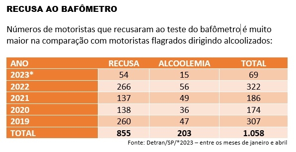 Em Fernandópolis, números do Detran.SP mostram que vem aumentando o número de motoristas que se recusam ao teste do bafômetro. Desde 2019 até abril deste ano, o número de motoristas que recusaram soprar no bafômetro foi de 855. No mesmo período 203 motoristas foram flagrados por alcoolemia.