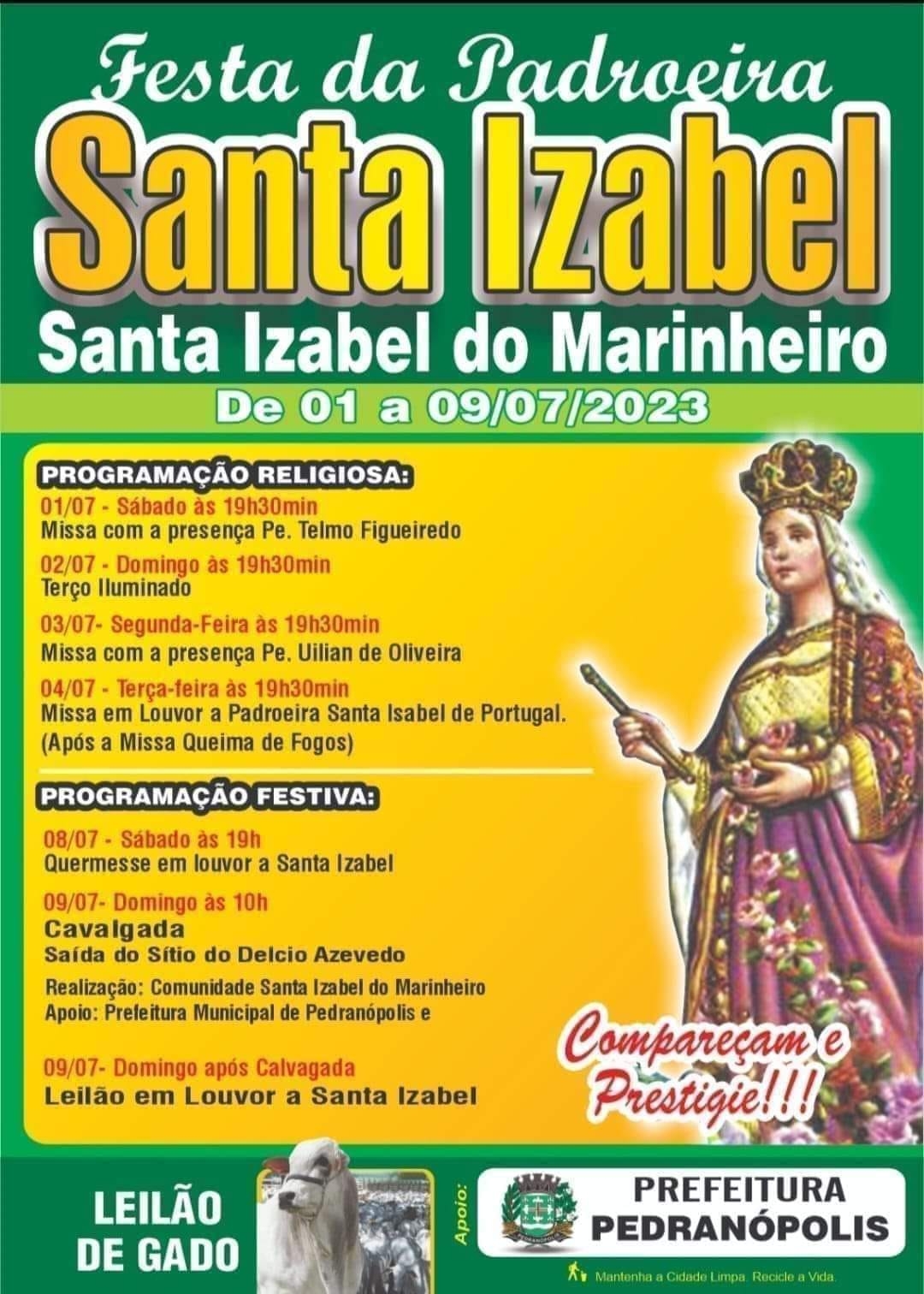 A comunidade católica do distrito de Santa Izabel do Marinheiro, celebra hoje, 04, o dia da padroeira Santa Isabel. Para celebrar a data, a partir das 19h30 acontece a missa solene, seguida pela procissão e queima de fogos.