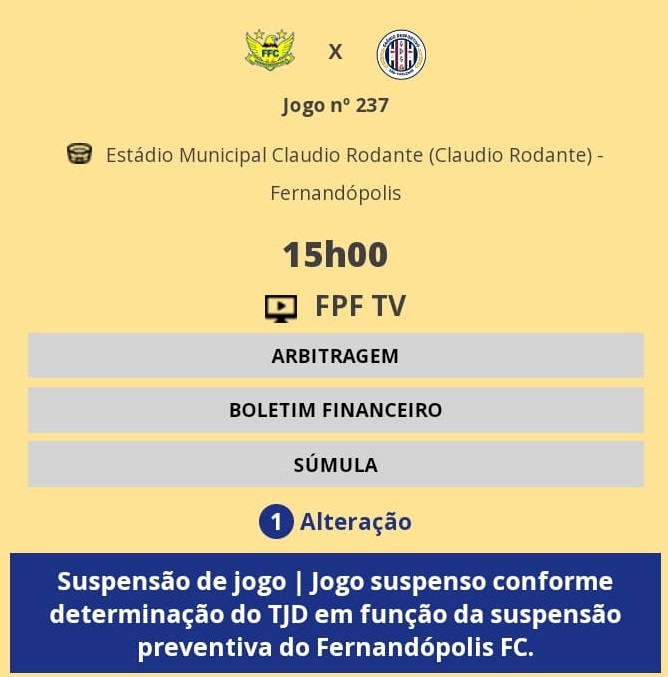 Diante da suspensão preventiva do Fernandópolis FC., a Federação Paulista determinou a suspensão do jogo envolvendo contra o Grêmio São-Carlense no Estádio Claudio Rodante marcado pela tabela para quarta-feira, 19, às 15 horas.