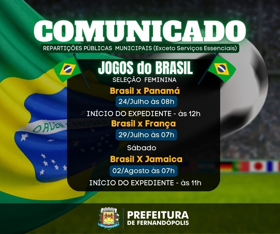 Hoje, 24, o expediente da Prefeitura Municipal de Fernandópolis irá iniciar às 12h, devido ao jogo da Seleção Brasileira Feminina de Futebol na Copa do Mundo. O decreto publicado no final de semana altera o horário de funcionamento e atendimento ao público nas datas em que o time brasileiro estiver competindo.