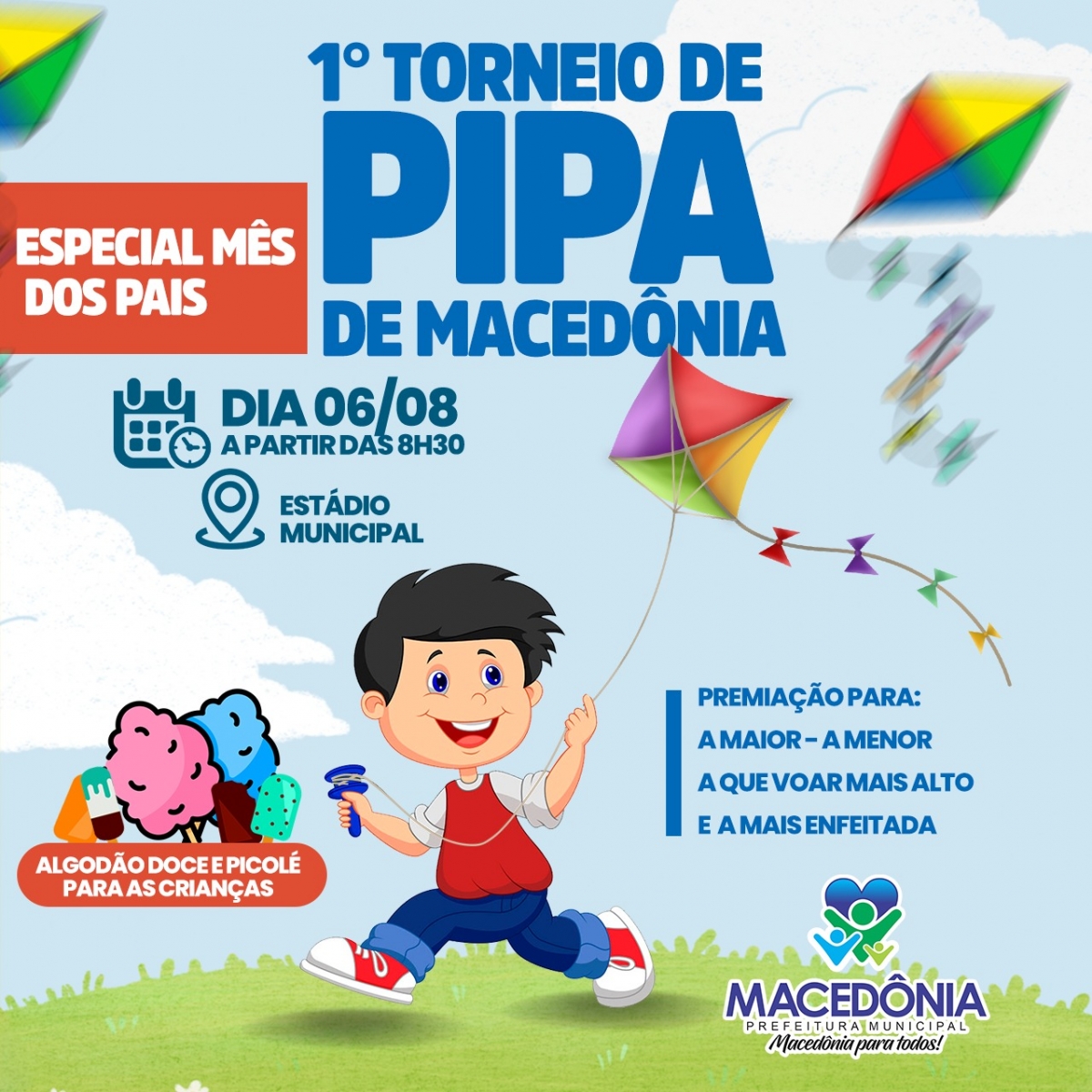 Neste domingo, 06, a Prefeitura de Macedônia realiza no Estádio Municipal o 1°Campeonato de Pipa. O evento faz parte da comemoração ao Dia dos Pais, que esse ano será celebrado no dia 13 de agosto.
