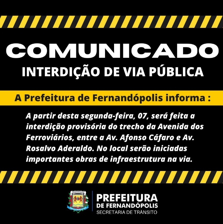 Por meio de um comunicado, a Prefeitura de Fernandópolis, por meio das Secretarias Municipais de Trânsito e Obras, informa a interdição provisória do trecho da Avenida dos Ferroviários, entre a Av. Afonso Cáfaro e Av. Rosalvo Aderaldo a partir de hoje, 07.
