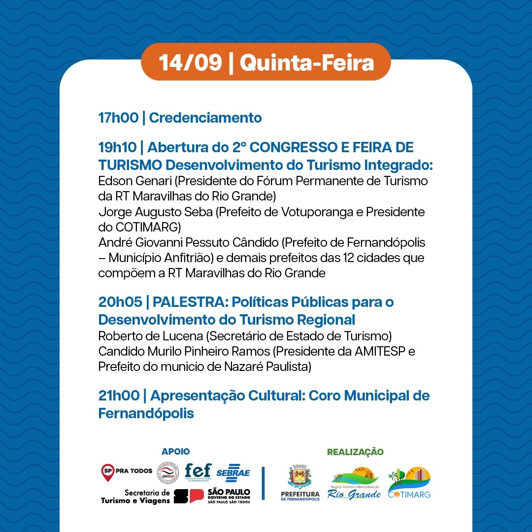 A cerimônia de abertura acontece às 19h e irá contar com a presença do presidente da Amitesp – Associação dos Municípios de Interesses Turísticos de São Paulo -, Cândido Ramos; do presidente Consórcio Turístico Intermunicipal Maravilhas do Rio Grande - e prefeito de Votuporanga, Jorge Seba; do prefeito anfitrião e organizador, André Pessuto; do presidente do Fórum Maravilhas do Rio Grande, Edson Genari; além dos representantes regionais dos municípios que integram a ‘Região Turística Maravilhas do Rio Grande’, que são os responsáveis pelo evento. Também existe a expectativa de ter a presença do secretário de Turismo do estado de São Paulo, Roberto de Lucena para falar sobre Políticas Públicas para o Desenvolvimento do Turismo Regional.