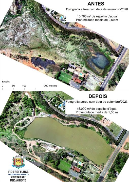 Prefeitura de Fernandópolis divulgou imagem da represa antes e depois do desassoreamento