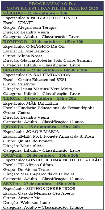 Desde o último domingo, 15, o auditório do Teatro Municipal Merciol Viscardi tem recebido um grande público durante as apresentações diárias da 27ª edição da Mostra Estudantil de Teatro de Fernandópolis. O evento segue até a próxima sexta-feira, 27, com sessões às 15 e 20h.