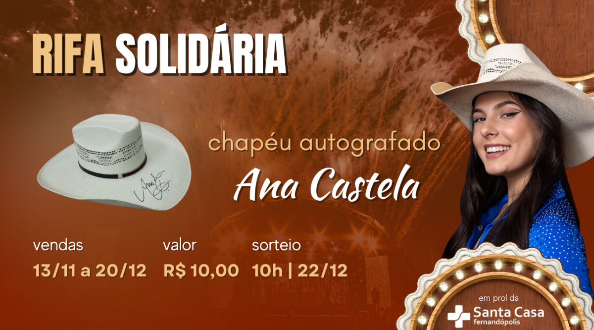 Com o retorno dos eventos sociais desde o início deste ano, a Santa Casa vai promover mais um evento beneficente. Desta vez, trata-se da realização de uma rifa solidária, em que o prêmio principal é um chapéu autografado pela cantora Ana Castela, adquirido durante sua participação na Expô Fernandópolis 2023. A rifa acontecerá de forma digital, e aqueles que quiserem participar podem comprar os números por meio do site.