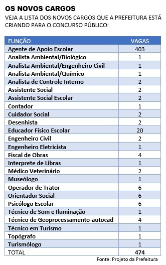 Algumas das funções a serem criadas, são novidades como turismólogo, museólogo, orientador social, psicólogo escolar e agente de apoio escolar (veja quadro). O maior número de vagas é para o cargo de agente de apoio escolar. As contratações realizadas pelo processo seletivo ou por empresas terceirizadas não atenderam expectativas das escolas.