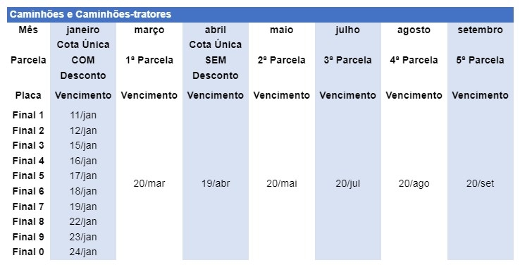 Os caminhões têm prazos diferenciados: para o pagamento integral em janeiro é concedido desconto de 3%; para os proprietários que optarem pelo parcelamento em três, quatro ou cinco vezes, sem desconto, os vencimentos são em 20 de março, 20 de maio, 20 de julho, 20 de agosto e 20 de setembro (veja as tabelas completas abaixo).