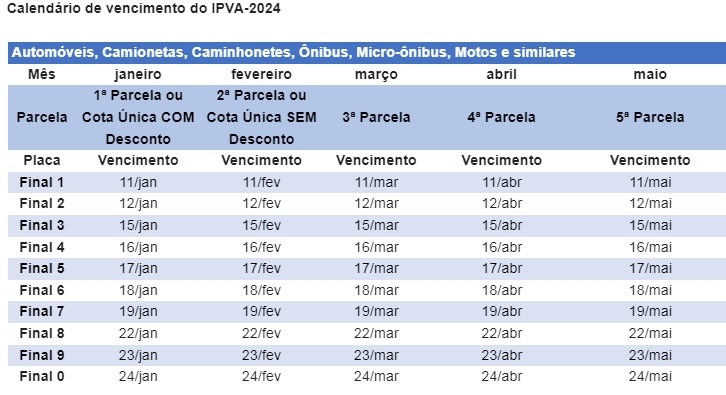Os proprietários deverão observar o calendário de vencimento por final de placa do veículo. Para efetuar o pagamento do IPVA 2024, basta o contribuinte utilizar a rede bancária credenciada, com o número do Renavam - Registro Nacional de Veículo Automotor. É possível efetuar o recolhimento pela internet ou débito agendado, nos terminais de autoatendimento ou outros canais oferecidos pela instituição bancária. Também é possível realizar o pagamento em casas lotéricas e com cartão de crédito.