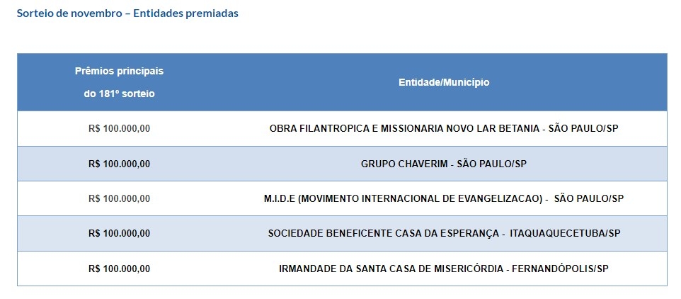 No total cinco entidades que prestam serviços assistenciais também vão encerrar 2023 com o caixa reforçado. Foram sorteadas pela Nota Fiscal Paulista e receberão o prêmio de R$ 100 mil a Sociedade Beneficente Casa da Esperança, de Itaquaquecetuba; a Irmandade da Santa Casa de Misericórdia de Fernandópolis; e outras três entidades da Capital: Obra Filantrópica e Missionária Novo Lar Betânia (Vila Princesa Isabel), Grupo Chaverim (Jardim Europa) e o Movimento Internacional de Evangelização (Bairro Engenheiro Goulart).