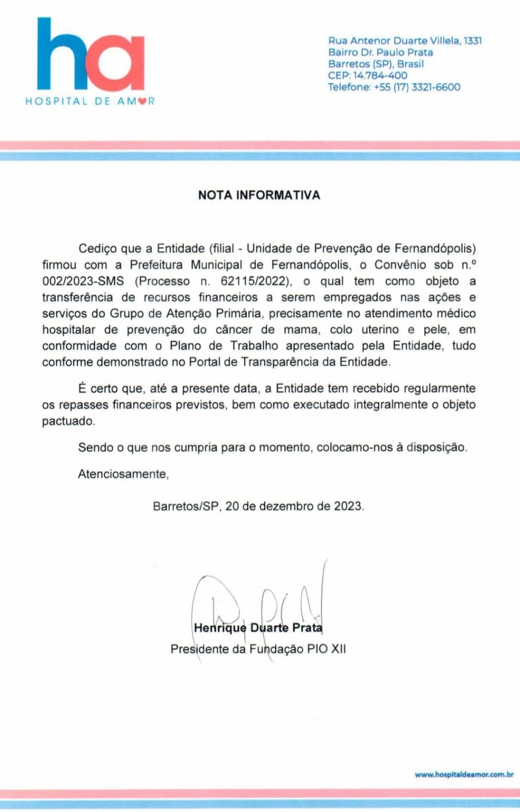 A Fundação Pio XII, mantenedora da Unidade de Prevenção do Hospital do Amor de Fernandópolis, se manifestou por meio de nota informativa sobre a regularidade de repasses da Prefeitura Municipal de Fernandópolis para a entidade.