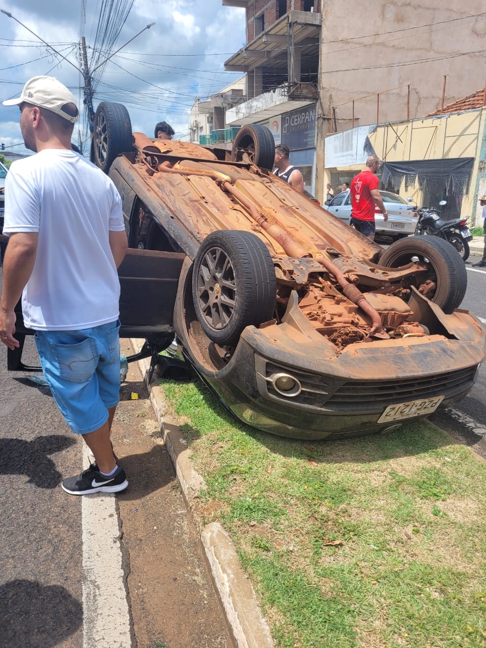 Um veículo ficou com as quatro rodas para cima no canteiro central da Avenida dos Arnaldo, em frente à sede da Casa da Agricultura, entre as Ruas Brasil e São Paulo, no sentido bairro-centro. O capotamento ocorreu, após o veículo colidir lateralmente com uma pick-up. O motorista do Gol não se feriu.