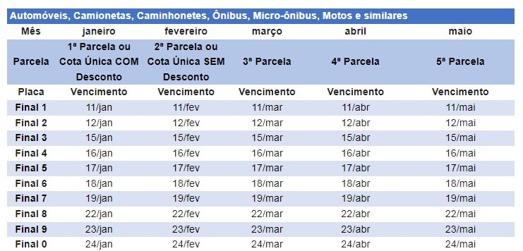 O prazo para o pagamento à vista e com desconto de 3% é para os veículos com final de placa 1. É também o prazo para quem optar pelo pagamento em cinco parcelas. O calendário segue o final da placa do veículo. Amanhã vence o prazo para os veículos placa final 2, segunda-feira final 3 e assim sucessivamente até o dia 24 quando termina o prazo para veículos com placa final zero.