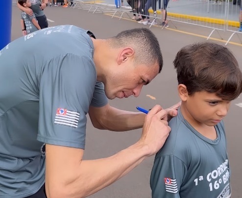 Atleta olímpico Altobeli Silva autografa camiseta de criança que participou da prova kids
