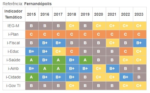 Nestas áreas Fernandópolis esteve melhor em meio Ambiente (B), gestão fiscal (B) e segurança das cidades (B). Ganhou C+ em Saúde, Educação e Governança. O pior desempenho foi em planejamento. Aliás, o planejamento desde 2015 está estagnado na nota C, ou seja, com avaliação “baixo nível de adequação”.