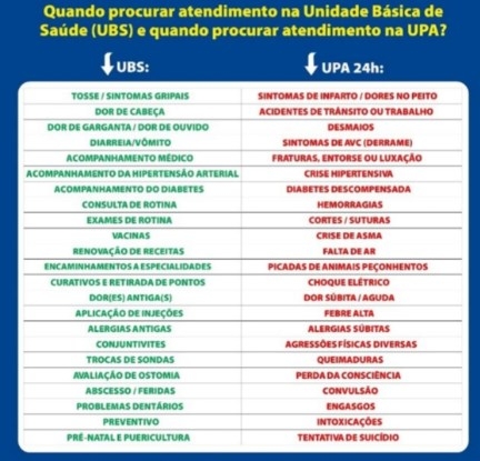 A rede de atendimento de saúde do município de Fernandópolis é formada por UBSs – Unidades Básicas de Saúde – e a UPA – Unidade de Pronto Atendimento. Para evitar a sobrecarga da UPA, que funciona para atender emergências, a Secretaria Municipal de Saúde decidiu lançar campanha de orientação à população sobre quando procurar a UBS e quando procurar a UPA – 24 horas.