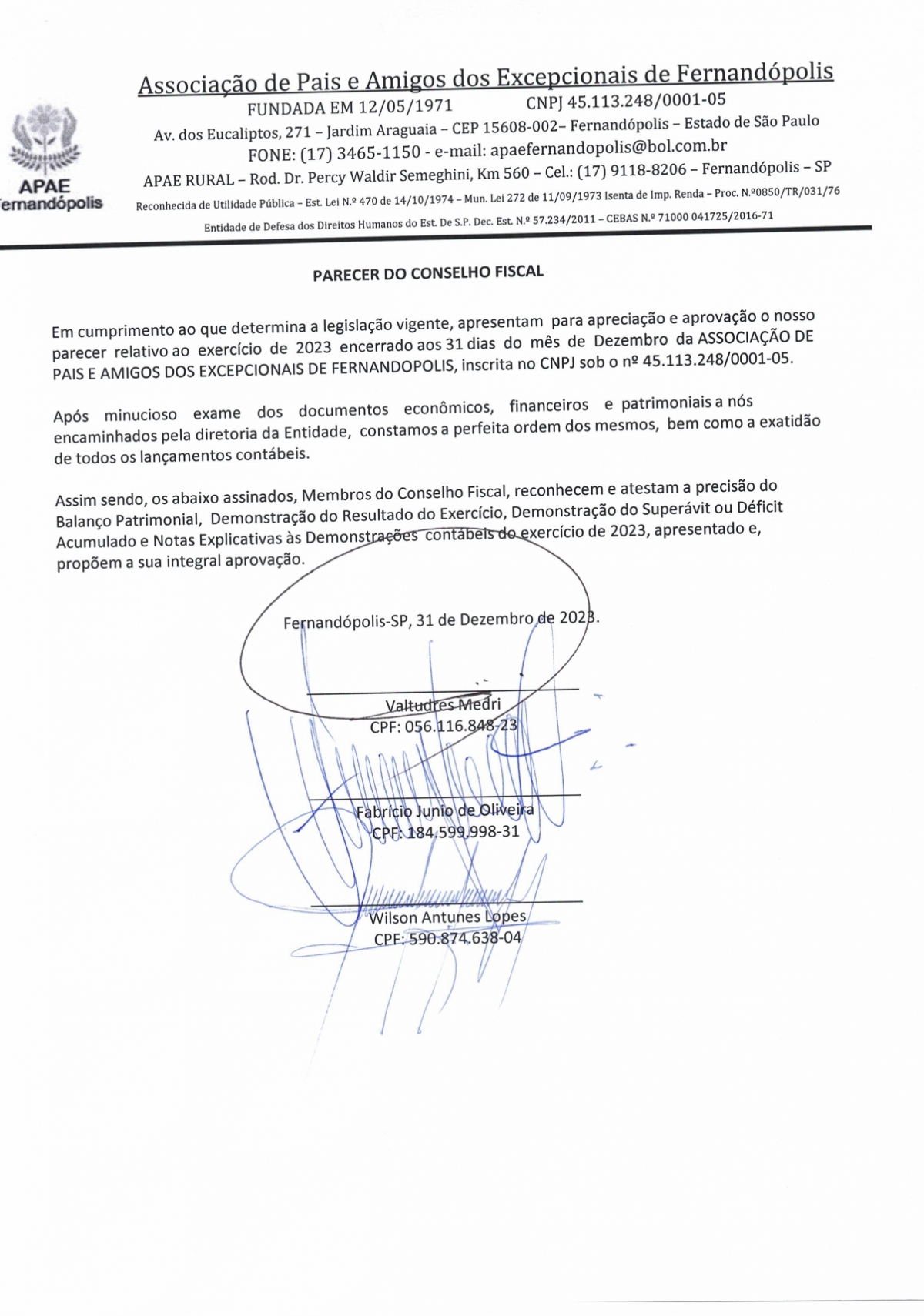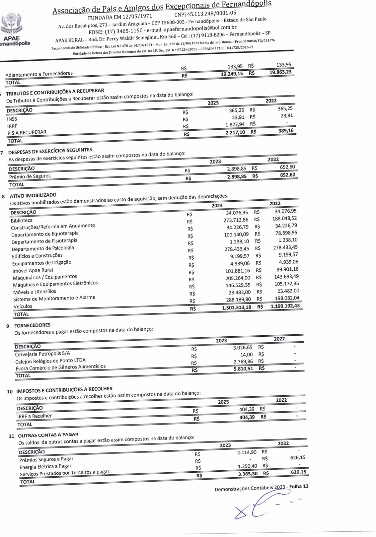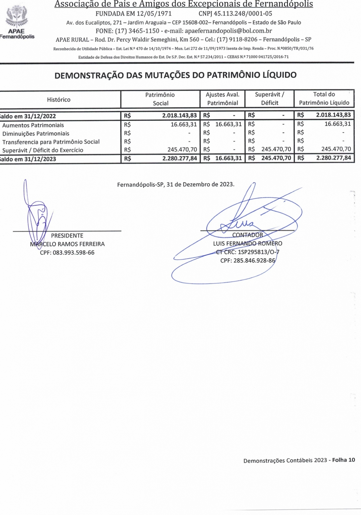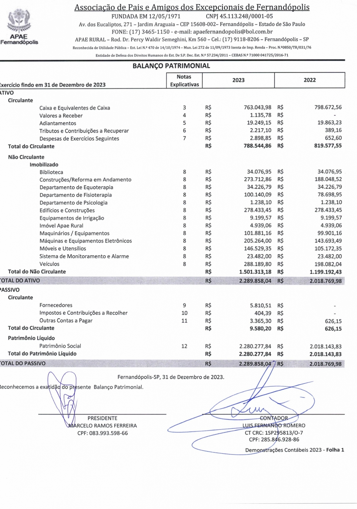 APAE - ASSOCIAÇÃO DE PAIS E AMIGOS DOS EXCEPCIONAIS DE FERNANDÓPOLIS - BALANÇO PATRIMONIAL 2023
