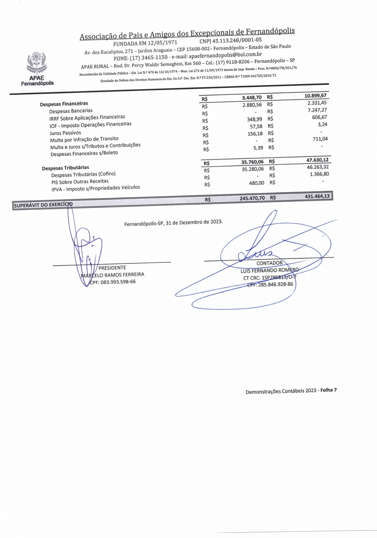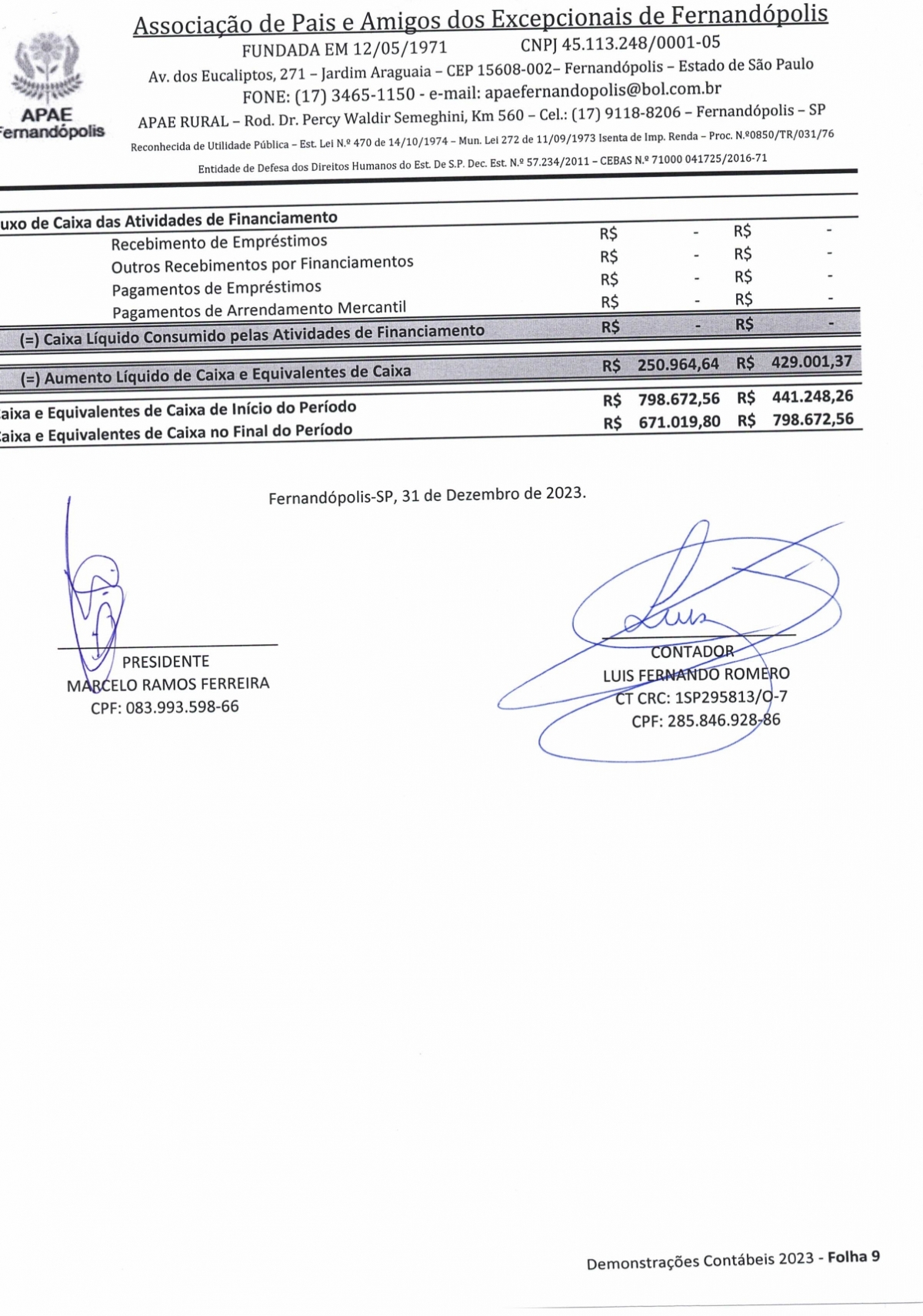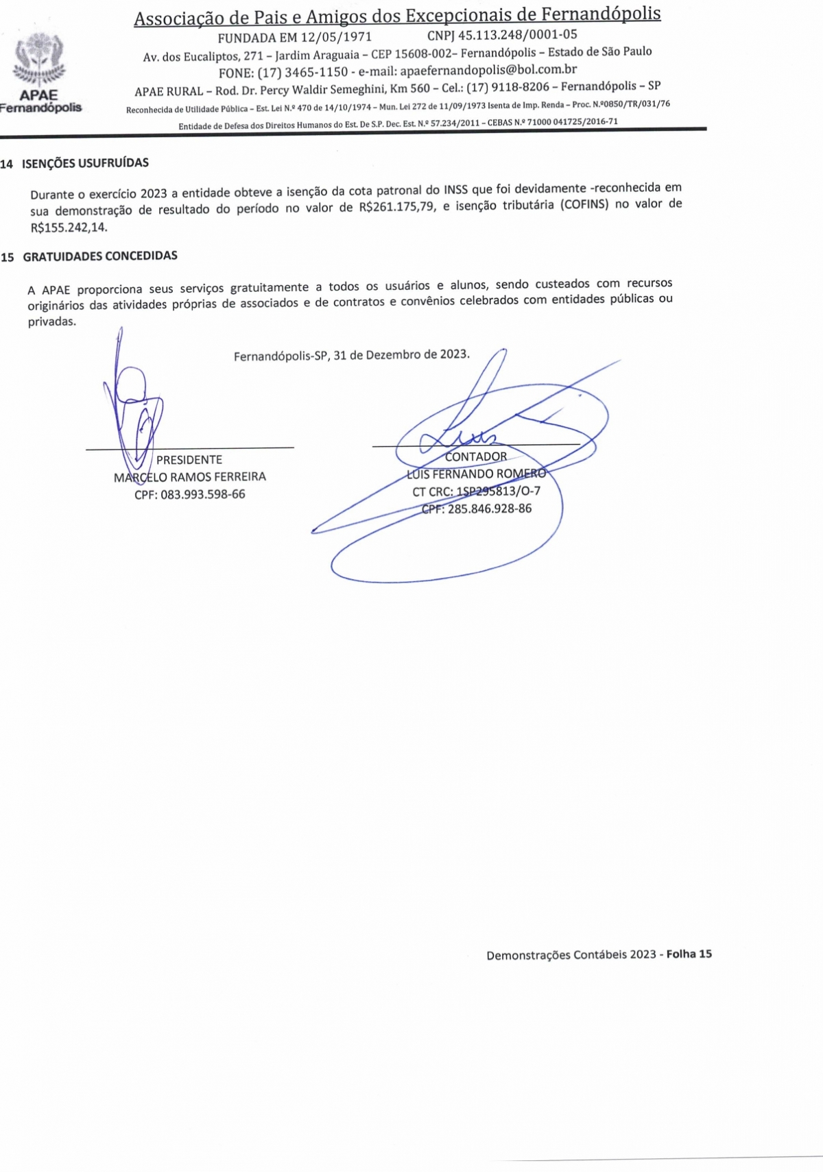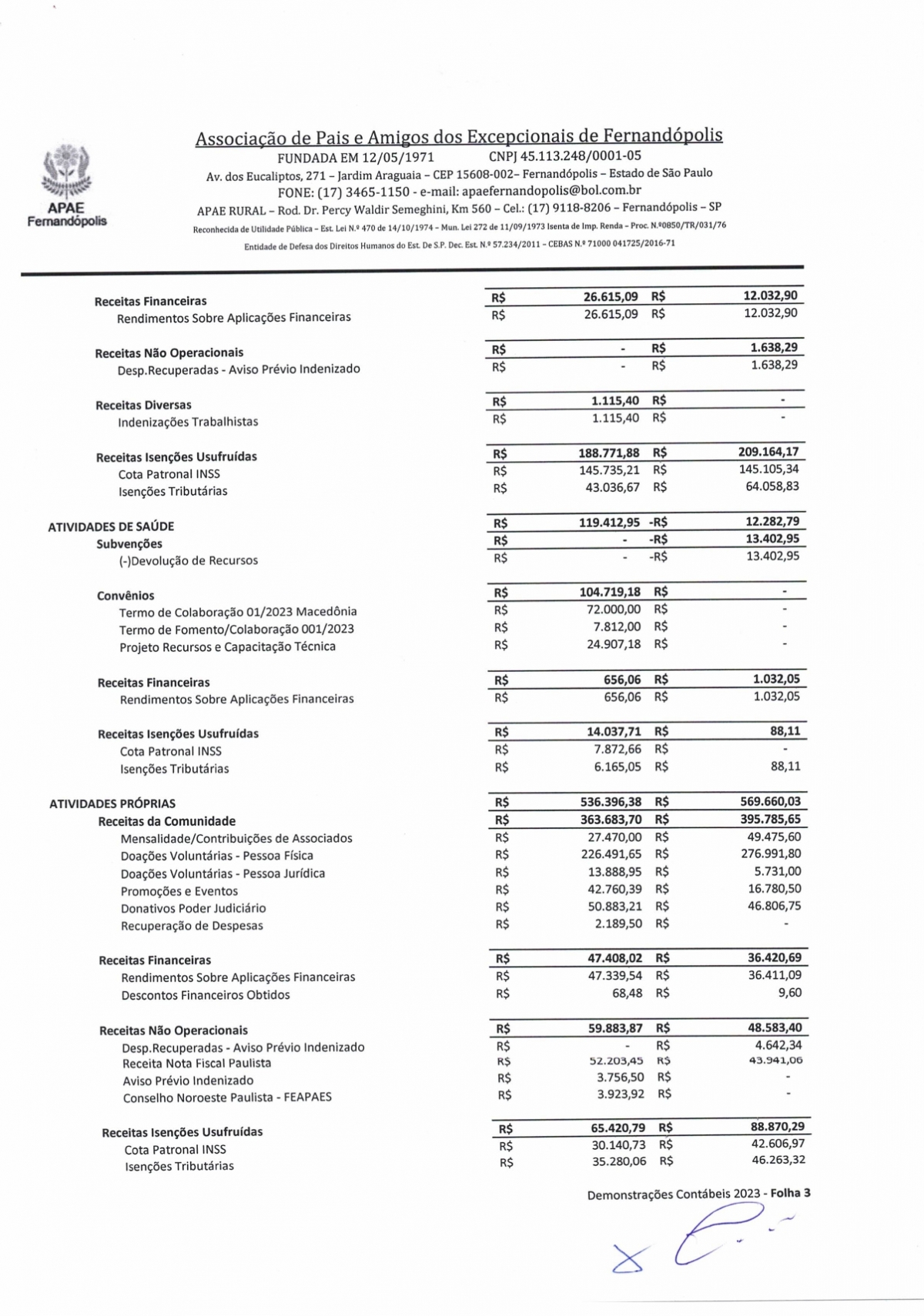 APAE - ASSOCIAÇÃO DE PAIS E AMIGOS DOS EXCEPCIONAIS DE FERNANDÓPOLIS - BALANÇO PATRIMONIAL 2023
