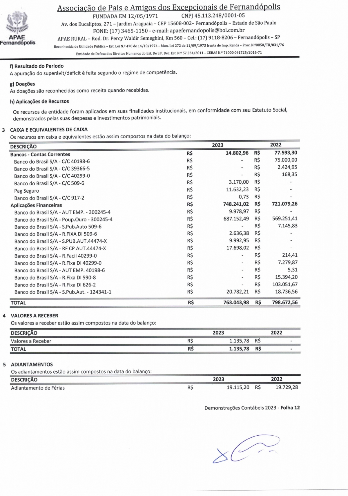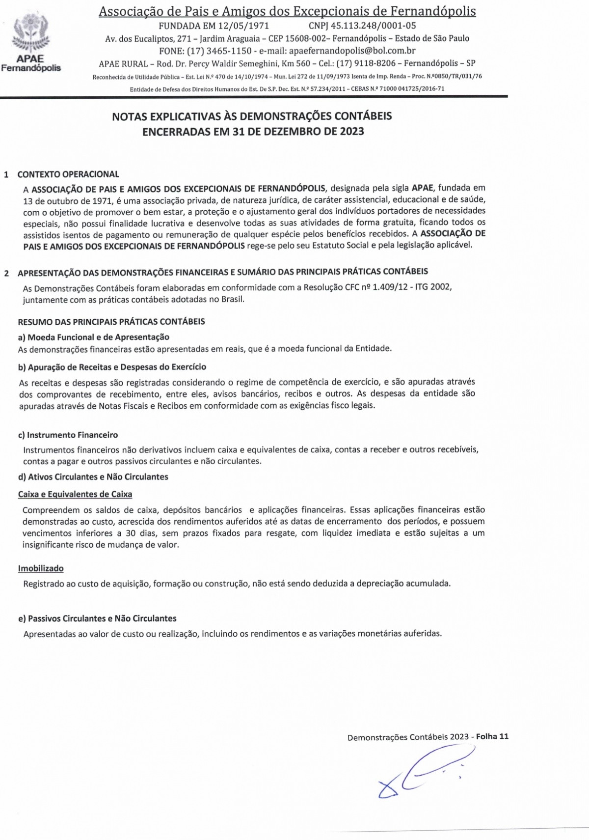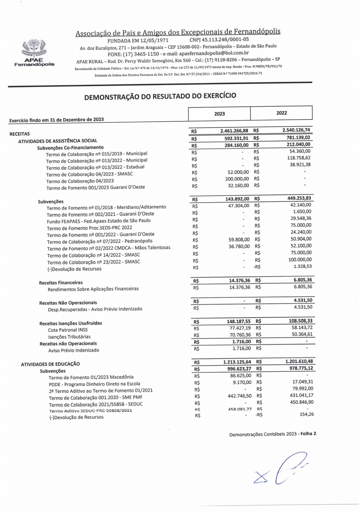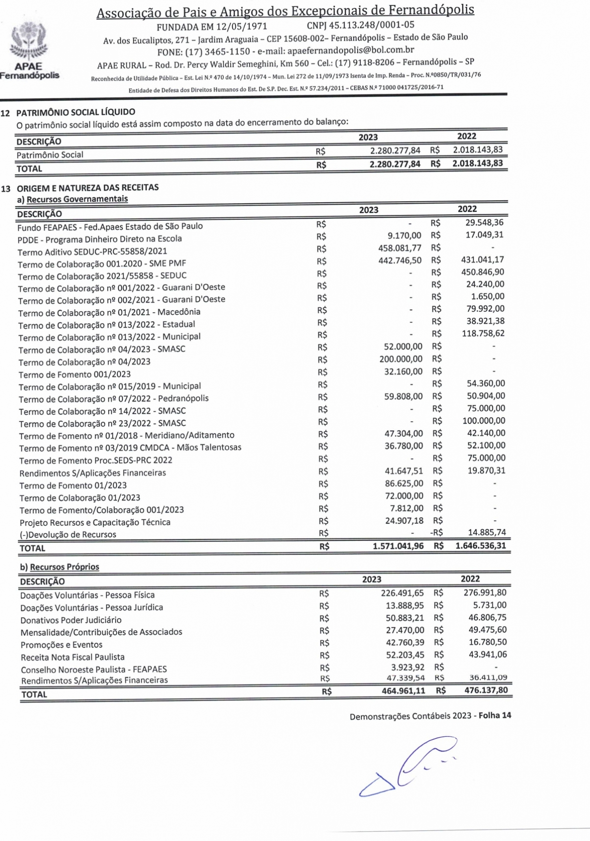 APAE - ASSOCIAÇÃO DE PAIS E AMIGOS DOS EXCEPCIONAIS DE FERNANDÓPOLIS - BALANÇO PATRIMONIAL 2023