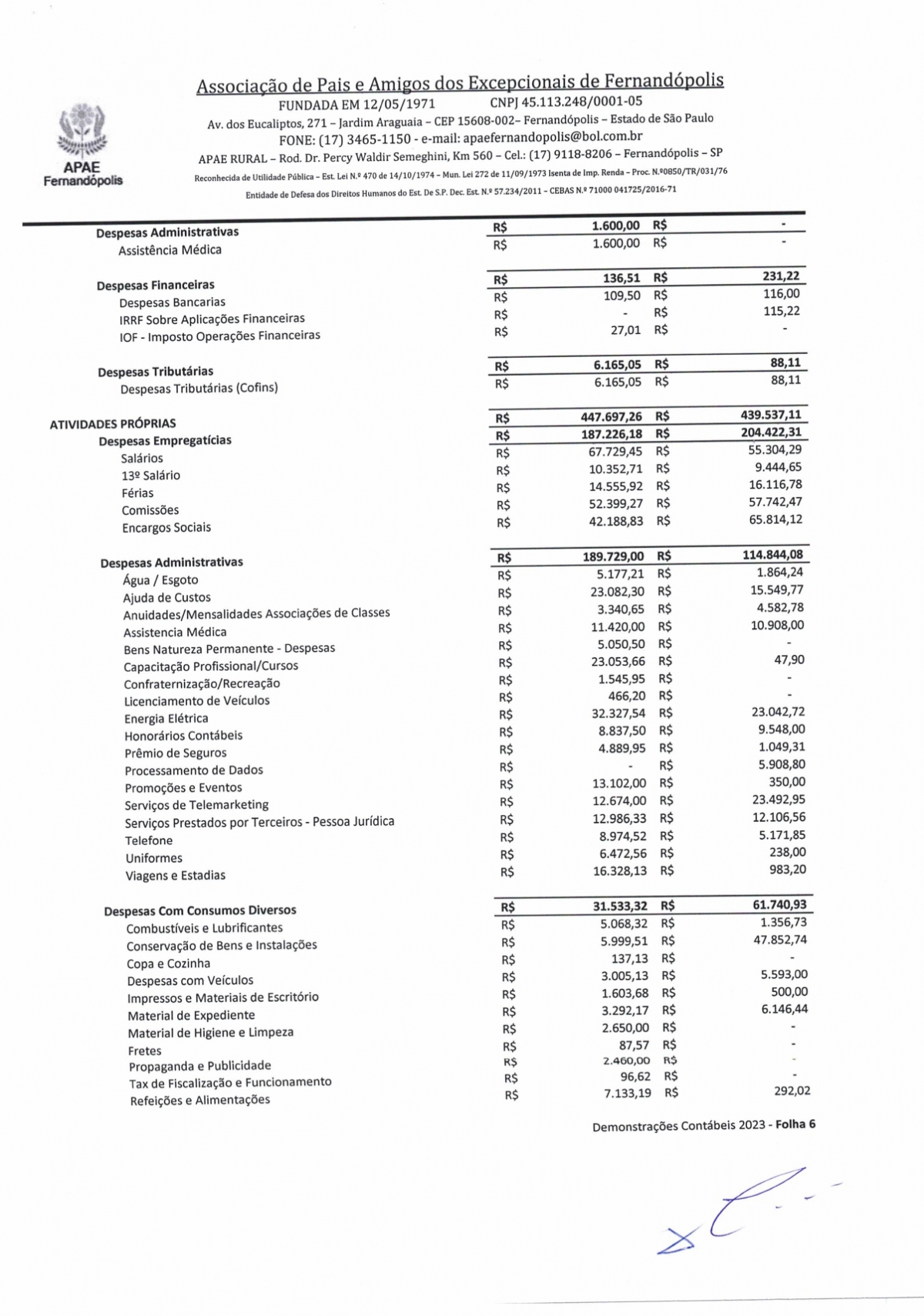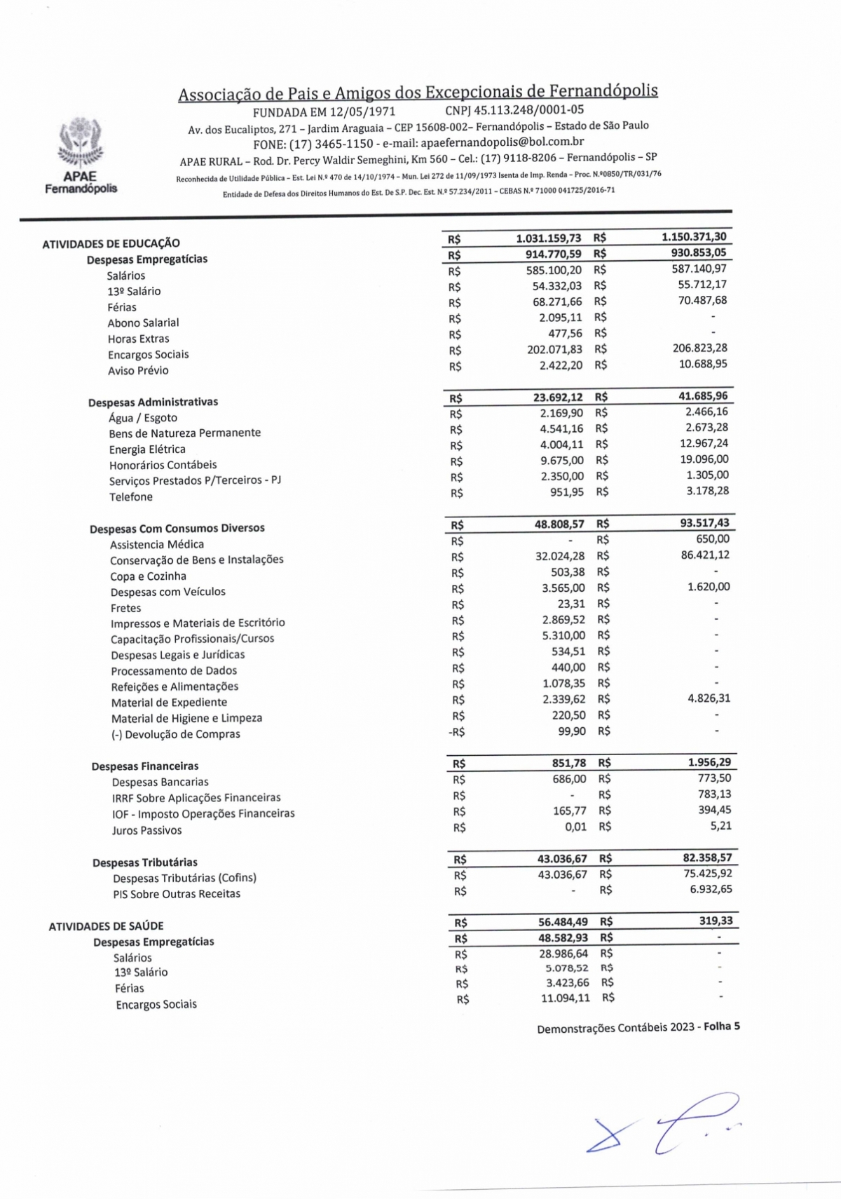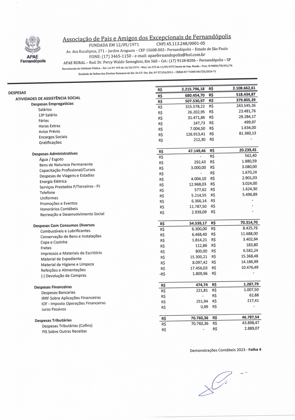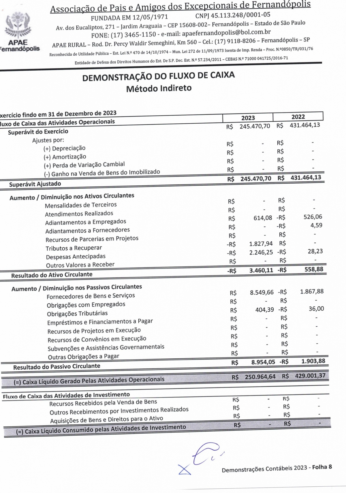 APAE - ASSOCIAÇÃO DE PAIS E AMIGOS DOS EXCEPCIONAIS DE FERNANDÓPOLIS - BALANÇO PATRIMONIAL 2023